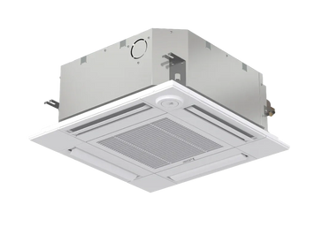 4-Way Cassettes are installed at the ceiling, recessing up into the attic space. Only the louvered grille is exposed, sitting flush with the ceiling, and blowing air in 4 directions.